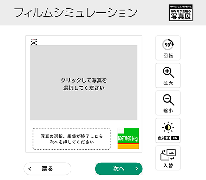 「回転」「拡大」「縮小」「色補正※」で写真を調整する。