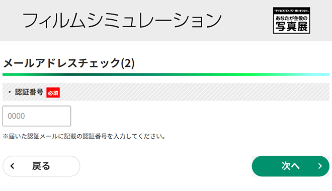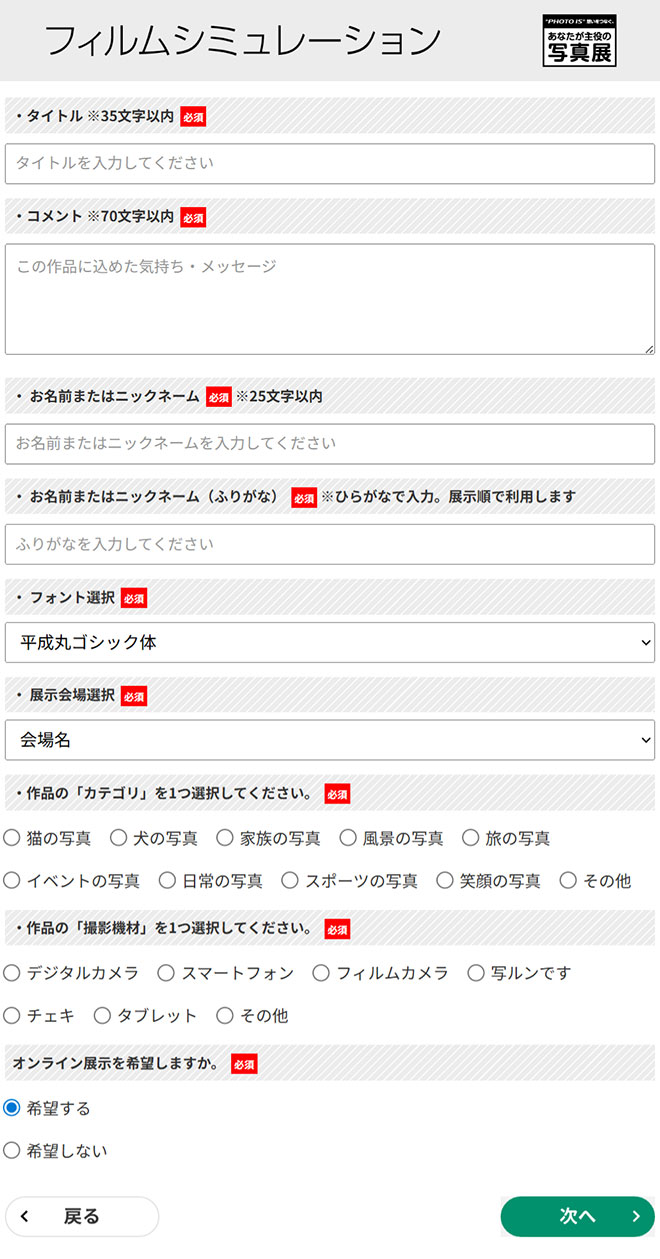 フォント、展示会場、オンライン公開の「カテゴリ」、撮影機材を選択し、入力が完了したら「次へ」のボタンを押す。
