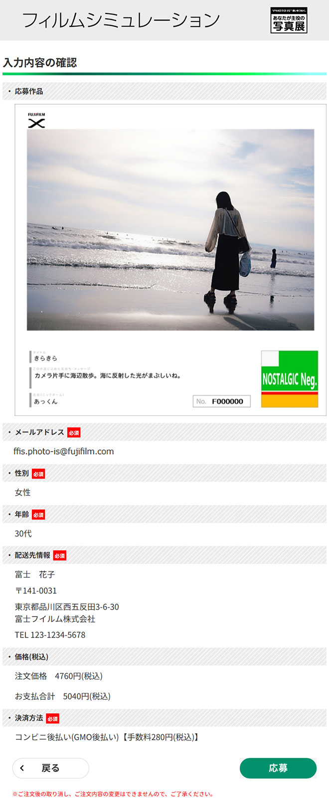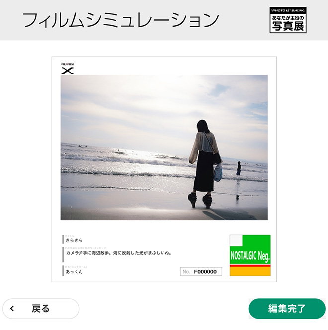 写真と、タイトル、この作品に込めた気持ち・メッセージ、氏名(ニックネーム)を確認し、編集完了ボタンを押す。
