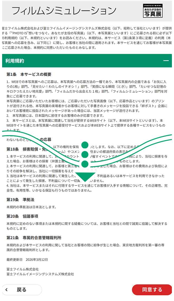 富士フイルム株式会社および富士フイルムイメージングシステムズ株式会社(以下、総称して当社といいます)が提供する「“PHOTO IS”想いをつなぐ。あなたが主役の写真展」(以下、本写真展といいます)にご応募される前に必ず以下の利用規約(以下、本規約といいます)をお読みください。本規約は、本サービス(第1条第3項に定義)の利用(本写真展への応募を含み、以下同じ)に関し、お客様と当社の間に適用されます。本サービスを通じてお客様が本写真展にご応募された場合、本規約に同意いただいたものとみなします。