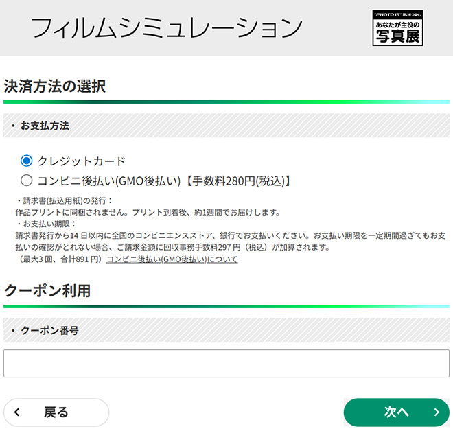 入力内容を確認する。前ページで選択したお支払方法に沿って必要な情報を入力する。